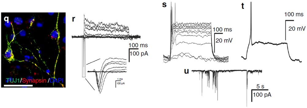 根據(jù)qRT-PCR結(jié)果,ptf1a重編程的hiNSC幾乎不表達多能性基因OCT4和NANOG。相反,它們高表達NSC標(biāo)志蛋白,包括SOX2、PAX6、NESTIN、OLIG2和FABP7(圖9 e-i)。體外分化試驗表明hiNSC具有三能性(圖9p,j-n)因此,Ptf1a具有類似的活性,可將人類成纖維細胞重編程形成三能性NSC。作者通過突觸素染色標(biāo)記試驗、電生理特性分析表明,ptf1a重編程的miNSC能夠分化為功能神經(jīng)元(圖9q,r-u)。
