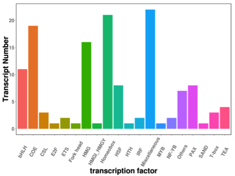 ????????轉(zhuǎn)錄因子也稱反式作用因子,在動植物的生長發(fā)育及其對外界環(huán)境的反應中起著重要的調(diào)控作用,通過轉(zhuǎn)錄因子注釋或表達量聚類分析,挖掘調(diào)控生物表型的關鍵轉(zhuǎn)錄因子。