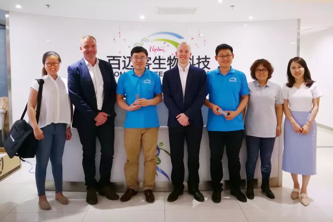 百邁客與Oxford Nanopore 商業(yè)運(yùn)營副總裁Richard ,中國區(qū)商務(wù)負(fù)責(zé)人Thomas及技術(shù)支持Lin與Eva一行合影