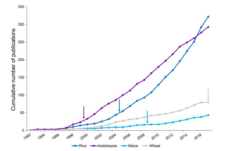 ATCG不規(guī)則的排列組合組成了地球上近870萬個物種形形色色的遺傳物質,而解密其內在調控機制是生物工作者心心念念奮斗的目標。1977年,噬菌體ΦX174長達5375-bp基因組被測序完成,基因組測序事業(yè)開始蓬勃發(fā)展,時至今日,NCBI收錄了超過6000個真核生物和150,000個原核生物的測序數(shù)據(jù),其中包括禾本科。而基因組研究目的也從單純的科學研究向實踐應用發(fā)生著轉換。基因組學和生物技術相結合,包括標記輔助選擇,基因組選擇和基因編輯,已成為育種中不可缺少的工具,功能基因的定位和克隆將會把這種技術的結合作用發(fā)揮更大。
