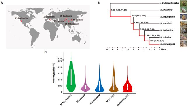 圖2、旱獺的地理位置,系統(tǒng)發(fā)育關(guān)系和雜合度分析