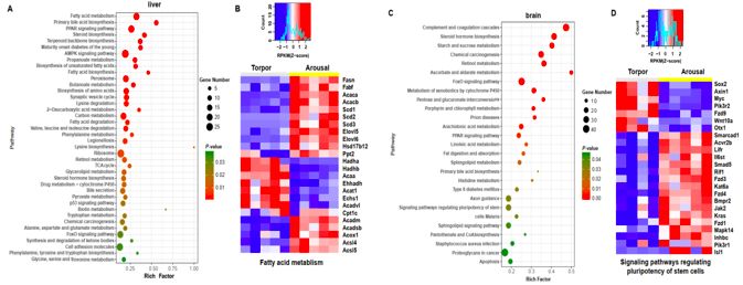 與其它高原哺乳動物不同,喜馬拉雅旱獺在冬季冬眠。為了闡述旱獺冬眠的分子機(jī)制,研究人員分析了來自喜馬拉雅旱獺肝臟和大腦的RNA-seq數(shù)據(jù),以表征在冬眠/覺醒周期中基因表達(dá)的變化。差異表達(dá)的基因(DEGs)顯著富集在肝臟中脂肪酸代謝,萜類骨架生物合成和初級膽汁酸生物合成的途徑(圖3 A)。并清楚地觀察到在冬眠狀態(tài)下,參與脂肪酸降解的基因的上調(diào)及參與脂肪酸合成的基因的下調(diào),暗示了一個√確的脂質(zhì)代謝調(diào)節(jié)機(jī)制(圖3 B)。此外,還發(fā)現(xiàn)在覺醒狀態(tài)下,包含與藥物代謝相關(guān)的基因-細(xì)胞色素P450,氨基酸的生物合成和碳水化合物分解代謝相關(guān)基因的總體下調(diào)。