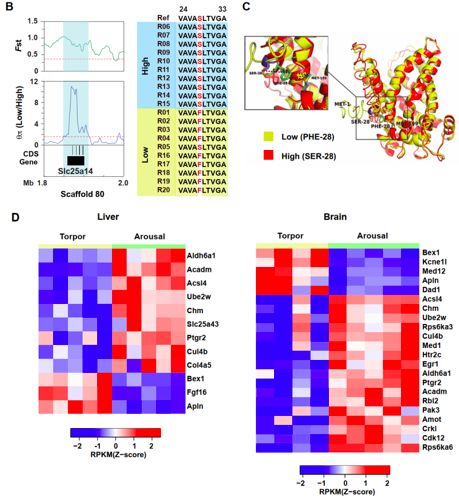 為了更好地了解喜馬拉雅旱獺的高原適應(yīng)性機(jī)制,研究人員從極高海拔(海拔> 4,500 m,n = 10)和相對低海拔(<1,900 m,n = 10)收集了20只喜馬拉雅旱獺。研究人員首先測量了血液參數(shù),發(fā)現(xiàn)與低海拔喜馬拉雅旱獺相比,高海拔喜馬拉雅旱獺的一些血液相關(guān)性狀,尤其是紅細(xì)胞計(jì)數(shù),血紅蛋白濃度和平均紅細(xì)胞體積顯著增加。接下來,對每個喜馬拉雅旱獺進(jìn)行了全基因組測序,并在喜馬拉雅旱獺基因組中搜索了具有高種群分化(Fst)和多樣性比率(qp,low/qp, high)的區(qū)域,最終鑒定了分布在喜馬拉雅土撥鼠基因組不同scaffolds?中的24.84 Mb受選擇的區(qū)域。這些區(qū)域含有383個功能基因,與非選擇性基因相比,這些基因具有更高的Ka / Ks值(P <0.01),主要功能類別包括“缺氧反應(yīng)”,“DNA修復(fù)”,“血管生成”,“心臟功能”,“脂肪酸代謝”,“細(xì)胞周期”,“發(fā)熱”和“鈣信號通路”。參與缺氧誘導(dǎo)因子-1(HIF-1),血管內(nèi)皮生長因子(VEGF)或其它缺氧相關(guān)信號通路的10個功能基因,包括Slc25a14,Nox-1,Hmox1,Vegfr2,Atg16l2,Bex1,Ptgr2,Gprasp1,F(xiàn)am46d?和Chd3,在高海拔和低海拔群體之間顯示出明顯的基因分型差異(圖4 A)。在Slc25a14中發(fā)現(xiàn)了非同義替換(由Ser28取代Phe28,F(xiàn)28S),其顯示出*強(qiáng)的分化信號(FST = 0.73)(圖4 A和B)。基于同源建模的Slc25a14的三維結(jié)構(gòu)顯示,F(xiàn)28S替換發(fā)生在N末端的loop區(qū)域,并且由于氨基的電荷和極性的變化而增加其與相鄰的α-螺旋的距離(圖4 C)。為了進(jìn)一步評估這一變體的功能影響,研究人員將突變體Slc25a14與其在不同哺乳動物中的直系同源基因進(jìn)行比對,并發(fā)現(xiàn)Phe28在比對的其它動物中高度保守。該突變體功能影響的預(yù)測證明F28S取代是有害的,所有這些結(jié)果都表明F28S突變可能是高海拔群體Slc25a14選擇性清除的結(jié)果。為了推測旱獺高海拔適應(yīng)和冬眠的遺傳適應(yīng)性機(jī)制,研究人員在選擇性清除區(qū)域鑒定到了116個差異表達(dá)基因,在這些基因中,25個差異表達(dá)基因與HIF-1途徑相關(guān),主要屬于DNA修復(fù),血管生成,脂肪酸代謝,細(xì)胞凋亡/細(xì)胞周期和發(fā)熱的類別相關(guān)。在冬眠/覺醒周期中,大量選擇性清除基因具有差異表達(dá),表明這兩種生物學(xué)過程之間存在共同的遺傳影響(圖4 D)。在這些基因中,Bex1, Apln, kcne1l, Med12, Dad1和Fgf16在冬眠階段肝臟或腦中顯著上調(diào)(圖4 D),進(jìn)一步證明這些基因參與冬眠和高原適應(yīng)性,先前的研究報(bào)道了這些基因參與許多生理過程,包括神經(jīng)元分化,肝再生,血管生成和能量代謝,而這需要進(jìn)一步的實(shí)驗(yàn)驗(yàn)證。