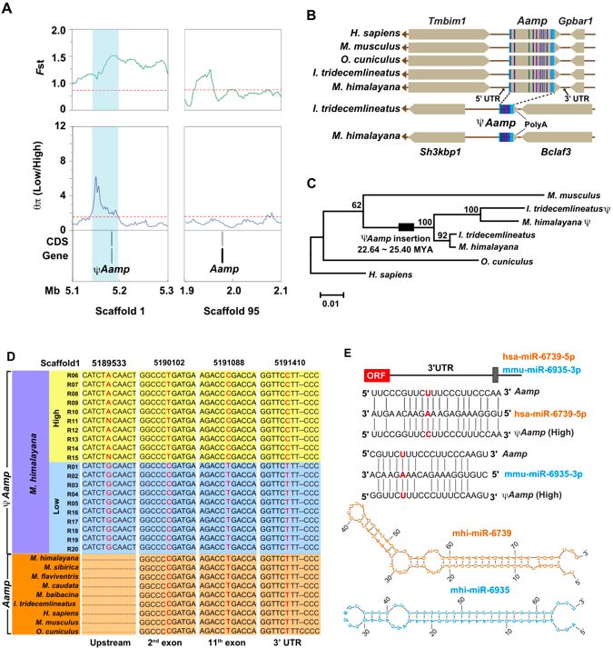假基因逐漸被認(rèn)定為是適應(yīng)性表型多樣化的重要調(diào)節(jié)因子,與選擇性清除信號相關(guān),研究人員鑒定了27個參與極高海拔適應(yīng)的候選假基因,占全基因組范圍內(nèi)假基因的1.83%。這一比率幾乎與具有1.78%的功能基因的比率相當(dāng),表明它們在極端環(huán)境的適應(yīng)性中的作用不可忽略。與蛋白質(zhì)編碼基因中發(fā)現(xiàn)的群體基因型差異一致,研究人員在高海拔群體中觀察到受選擇的假基因中幾乎固定的突變,例如ΨAamp,ΨAdl1和ΨRnf114。在這些假基因中,血管相關(guān)的遷移細(xì)胞蛋白假基因(ΨAamp)具有完整的基因結(jié)構(gòu)并顯示出*高的Fst值(Fst = 0.67),但ΨAamp未被檢測為受選擇性基因(圖4 A和5 A)。ΨAamp的結(jié)構(gòu)顯示它是一個整合的加工假基因,其mRNA通過逆轉(zhuǎn)錄被插入基因組中(圖5 B)。這個假基因含有過早終止密碼子(第208個核苷酸,C> T),缺失/插入和移碼突變,使其不能翻譯成功能性的蛋白,Aamp和ΨAamp的共線性分析表明在不同哺乳動物中Aamp是高度保守的。然而,在地松鼠和喜馬拉雅旱獺中發(fā)現(xiàn)并保存了高度保守的共線性位點(diǎn)(圖5 B),進(jìn)一步的系統(tǒng)發(fā)育分析表明,ΨAamp和Aamp屬于兩個獨(dú)立的分支,基于序列分歧插入時間的估算暗示假基因的插入事件發(fā)生在約22.64~25.40 MYA,在喜馬拉雅旱獺和地松鼠分化之前(圖?5 C)。這些發(fā)現(xiàn)支持古老的假基因?qū)τ谒墒缶哂刑禺愋圆墓餐淖嫦冗z傳而來這一假設(shè),然而,與地松鼠相比,喜馬拉雅旱獺顯示Aamp和ΨAamp之間的序列距離較小,這表明存在選擇性壓力來維持旱獺的遺傳元素。