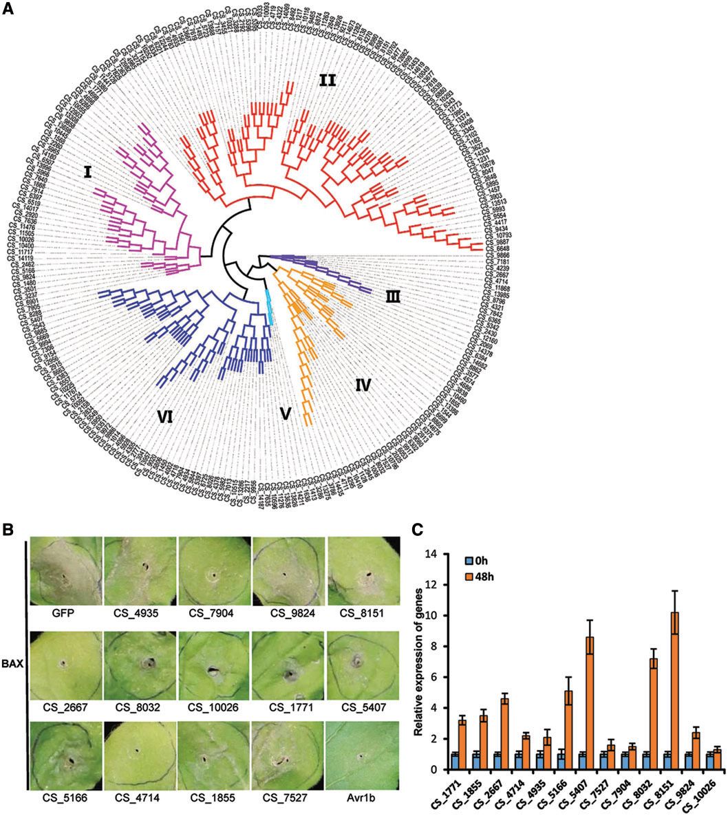 因此,我們嘗試研究效應(yīng)器功能。促凋亡小鼠蛋白BAX誘導(dǎo)的本氏煙草程序性細(xì)胞死亡(PCD)在生理上可能與病原體引起的防御相關(guān)的過敏反應(yīng)相似,提供了有價(jià)值的篩查可以抑制與防御相關(guān)的PCD的效應(yīng)物的方法。我們隨機(jī)選擇50個(gè)效應(yīng)子并在本塞姆氏煙草中瞬時(shí)表達(dá)它們以篩選可以抑制BAX觸發(fā)的PCD(BT-PCD)的潛在效應(yīng)物。結(jié)果表明,約1/4選擇的效應(yīng)子強(qiáng)烈抑制BT-PCD(圖7B)。此外,qRT-PCR結(jié)果顯示,大多數(shù)這些推定的效應(yīng)子在C.sojina感染后48小時(shí)被轉(zhuǎn)錄誘導(dǎo)(圖7C),這意味著它們可能有助于大豆灰斑病的早期感染。