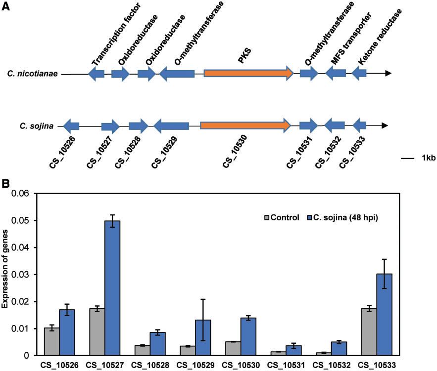 尾孢菌(Cercosporasojina)基因組編碼16個(gè)非核糖體肽合成酶(NRPS),20?個(gè)PKS,18個(gè)脂肪酸合成酶,3個(gè)萜烯合酶,2?個(gè)geranylgeranyl二磷酸合成酶和1種萜類化合物環(huán)化酶。這些酶參與次級(jí)代謝產(chǎn)物的合成,包括霉菌毒素,色素和生物堿。在C. sojina基因組中鑒定了一個(gè)具有8個(gè)尾孢菌素生物合成基因的類似基因簇。(圖4A)。這八個(gè)基因顯示高氨基酸序列與煙草(C. nicotianae)尾孢菌素生物合成基因的相似性在相同的串聯(lián)順序中(圖4A)。此外,我們觀察到感染期間8種基因的轉(zhuǎn)錄增加(圖4B)。