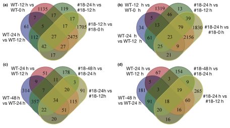 使用Illumina測序技術(shù)進(jìn)行轉(zhuǎn)錄組分析從而鑒定影響不定根生成的差異表達(dá)基因。不論在野生型還是過表達(dá)植株里,0h與12h的差異表達(dá)基因均多于12h vs. 24h和24h vs. 48h比較組。因此,在不定根誘導(dǎo)和萌發(fā)的前12h發(fā)生了大量基因的重塑。OE植株在前12h增加1518個差異表達(dá)基因,其中有119個基因在野生型的12h vs. 24h中出現(xiàn)(圖3)。這些結(jié)果表明,PagFBL1基因的高表達(dá)會增強促進(jìn)不定根形成的基因的表達(dá)變化。