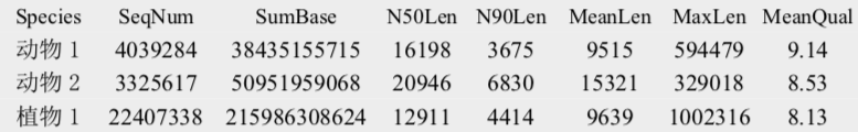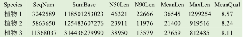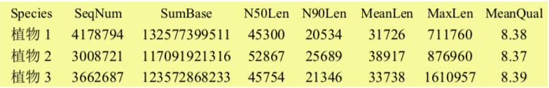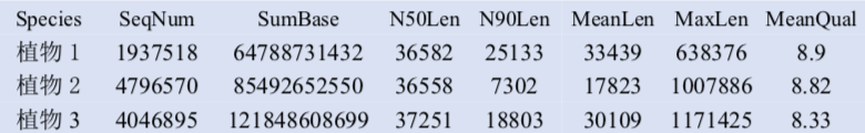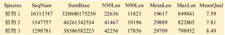 注:Species:分析的物種信息;SeqNum:各個長度范圍內(nèi)序列的數(shù)目;SumBase:指各個長度范圍內(nèi)序列的總長度;N50Len:reads N50長度;N90Len:readsN90長度;MeanLen:平均reads長度;MaxLen:最長reads長度;MeanQual:質(zhì)量值,準(zhǔn)確度=1-10^(-Q/10)