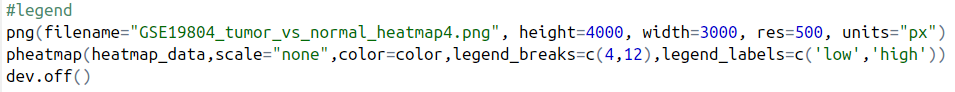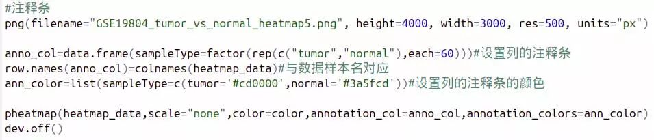 我們修改了字體大小,不顯示樣本名,以及設置圖片標題,到此時,經(jīng)過一系列參數(shù)更改,是不是已經(jīng)比一開始使用默認參數(shù)好看多了呢?(可以增加一個對比圖,GSE19804_tumor_vs_normal_heatmap6.png與GSE19804_tumor_vs_normal_heatmap1.png的 對比)。