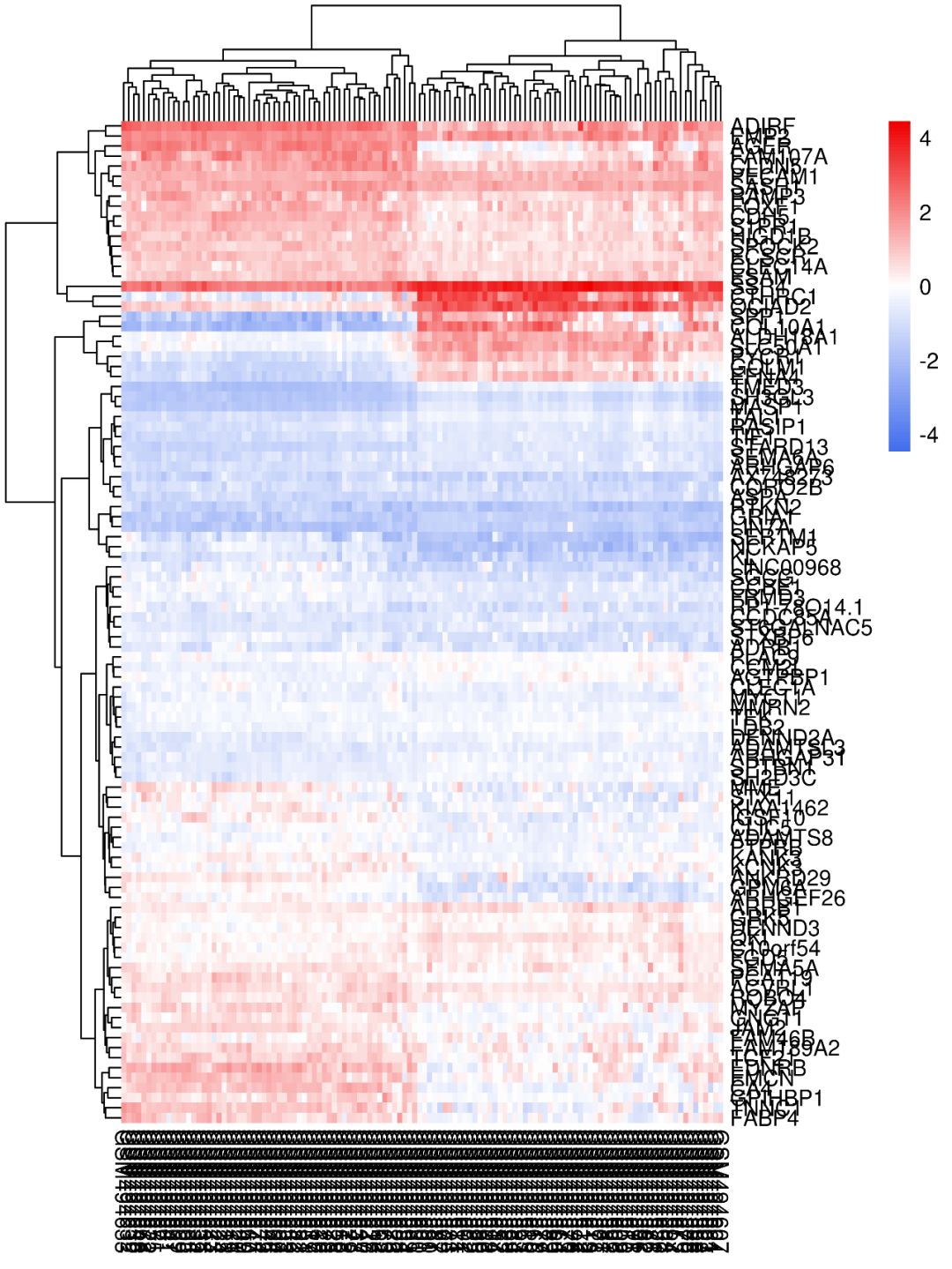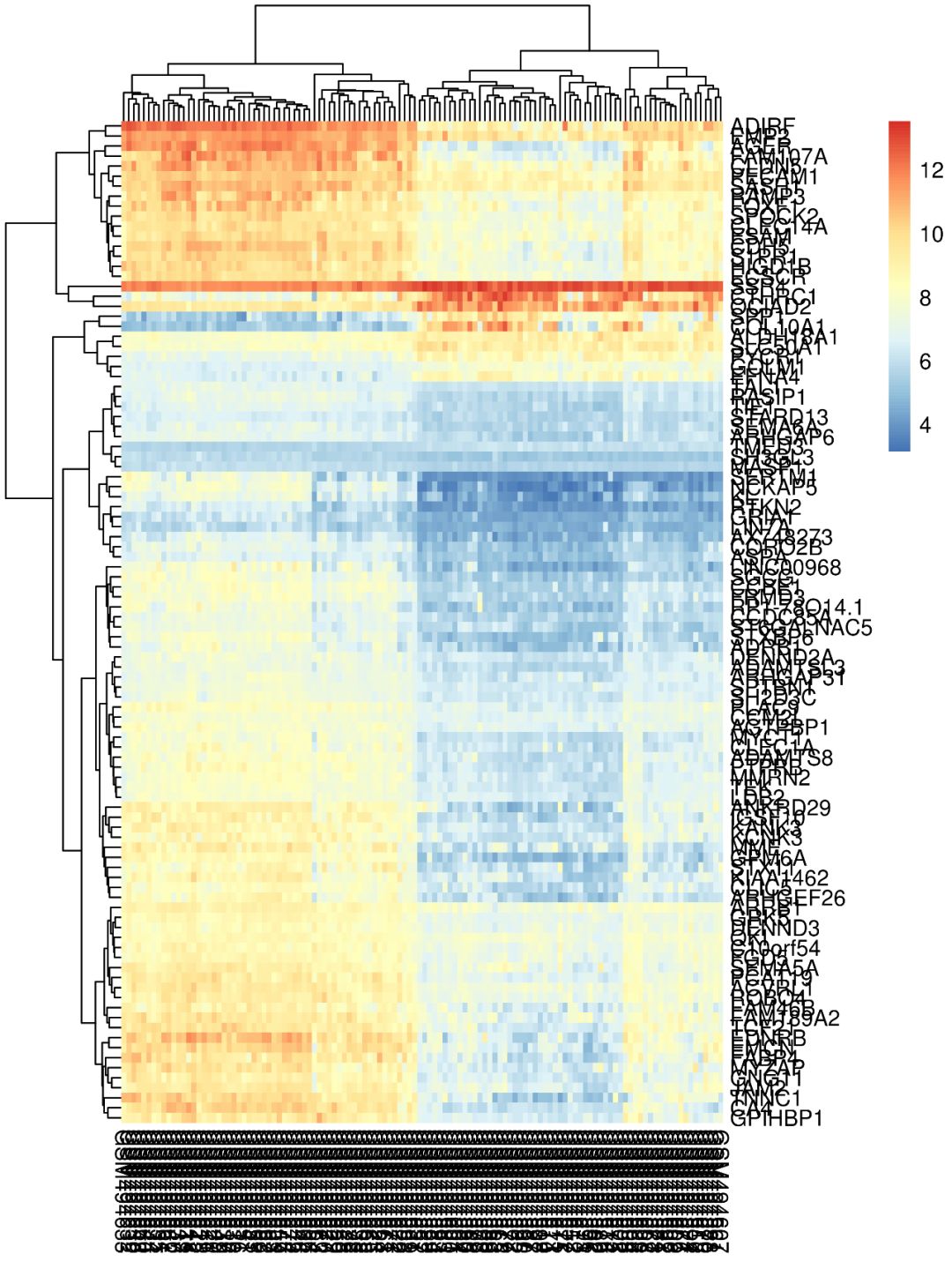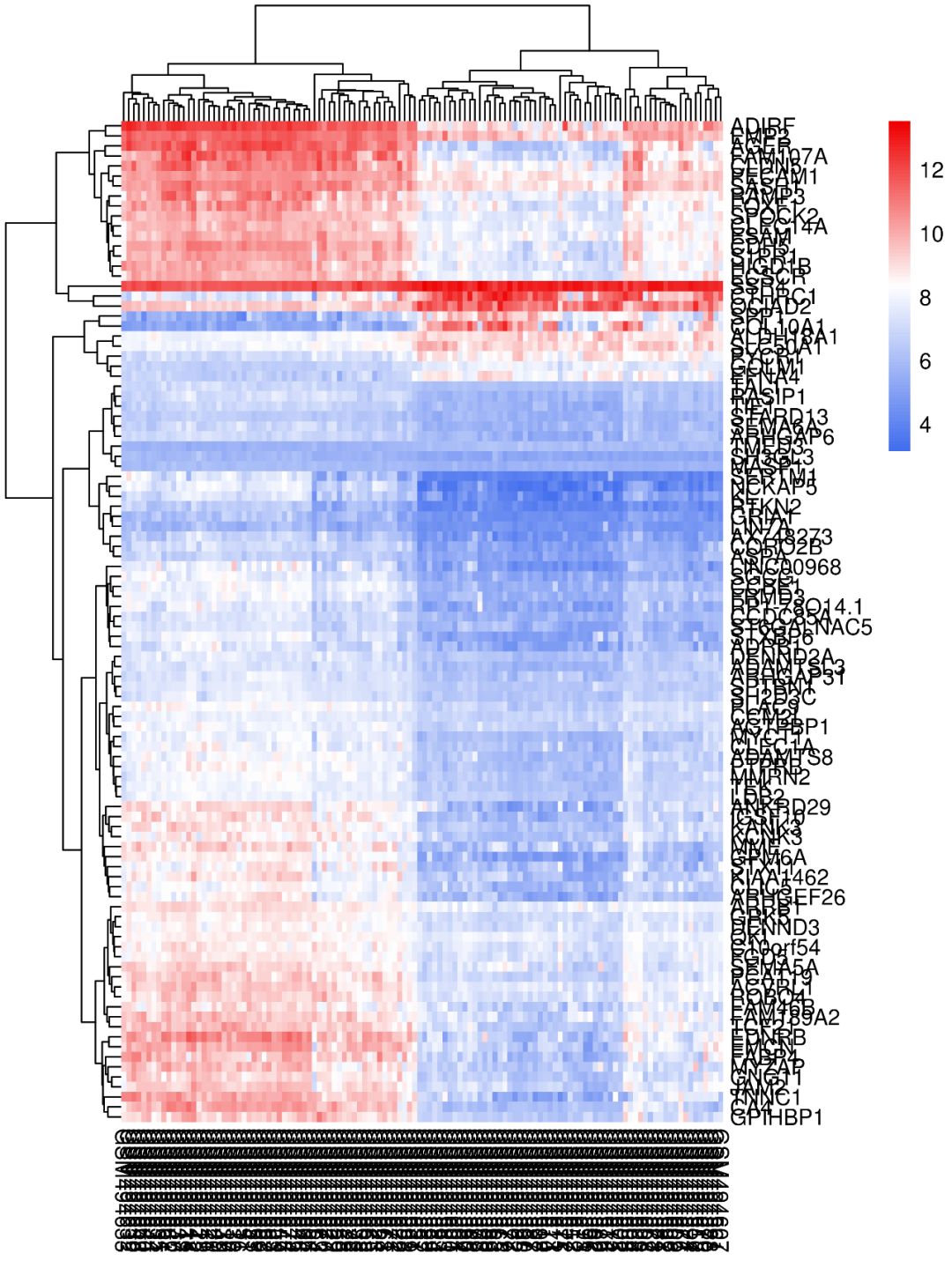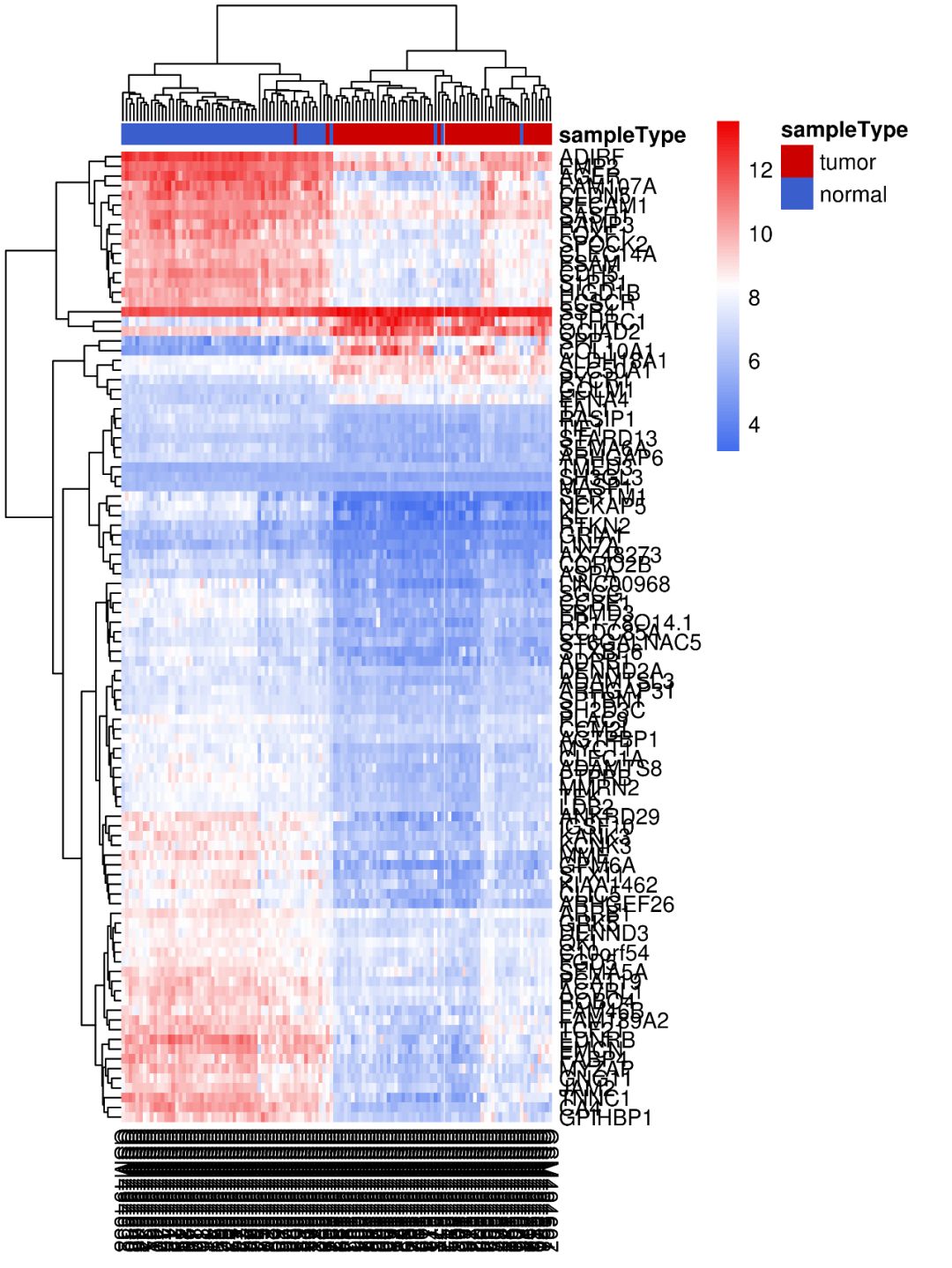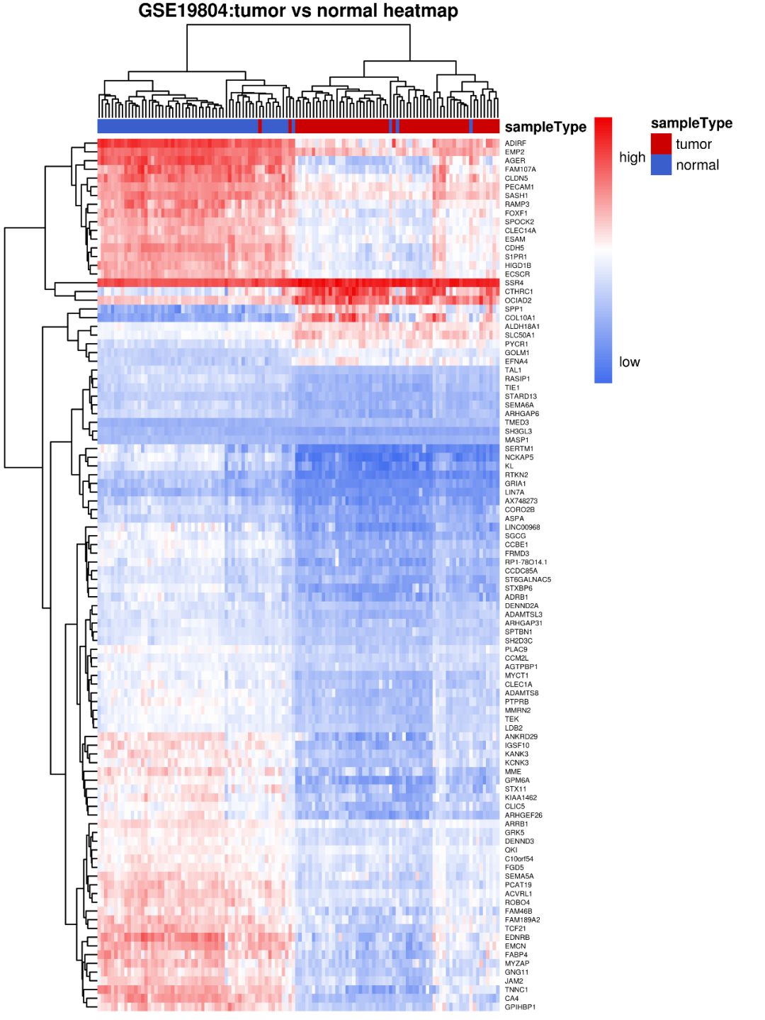 此次例子,我們選擇了一套GEO數(shù)據(jù)庫的肺癌數(shù)據(jù),數(shù)據(jù)編號為GSE19804,120個樣本,其中包含60個癌癥樣本和60個癌旁正常樣本,前面我們使用t檢驗,并對p值進行BH校正,篩選fdr小于0.01的基因中前100個在癌癥相對于正常樣本中顯著差異表達的基因進行熱圖繪制。