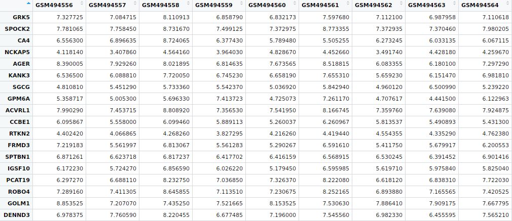 我們現(xiàn)在將數(shù)據(jù)進行行均一化,聚類方法選擇complete,進行均一化之后的熱圖還沒有前面的好看,查看數(shù)據(jù)表達情況,我們發(fā)現(xiàn)最小的表達值3.149和最大的表達值13.533之間并沒有相差很大,因此這套數(shù)據(jù)其實不適合做均一化處理,畫出來的熱圖更好看。