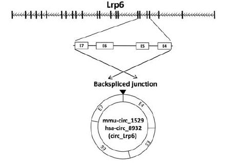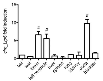 divergent primer擴(kuò)增cDNA和gDNA,驗(yàn)證其來源于可變剪接;RNAse R抗性檢測(cè);放線菌素D處理抑制轉(zhuǎn)錄證實(shí)circRNA的穩(wěn)定性(更長(zhǎng)的turn-over時(shí)間);qRT-PCR檢測(cè)各組織中circ_Lrp6表達(dá)水平并結(jié)合RNA-seq數(shù)據(jù)進(jìn)行分析:circ_Lrp6和Lrp6在血管中富集。
