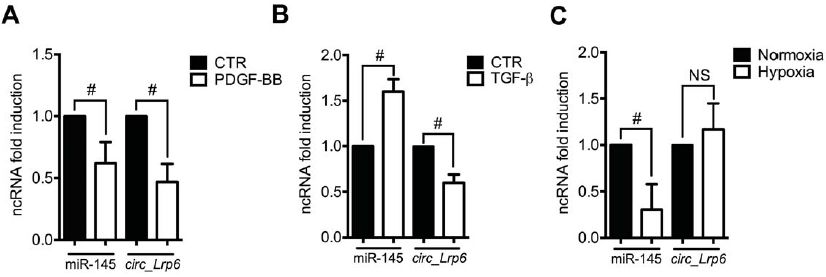 血小板衍生生長(zhǎng)因子(PDGF-BB)和轉(zhuǎn)化生長(zhǎng)因子(TGF-β)分別處理VSMC,在TGF-β處理的細(xì)胞中circ_Lrp6和miR-145表達(dá)之間存在負(fù)相關(guān)。