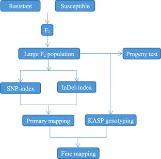 ? ? ? 本研究采取一種新的組合策略(圖1.),即兩步信息分析SNP-index與InDel-index共定位,結(jié)合KASP標記分型精細定位,快速定位到特定性狀候選基因,為克隆Cf-10基因以及分子標記輔助育種提供一條強力有效的途徑。
