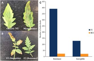 為考察Cf-10的遺傳基礎(chǔ),作者對品種Ontario 792,Moneymaker及其F1,F(xiàn)2與BC1F1群體的抗病能力進行評估。結(jié)果顯示,品種Moneymaker對10種病菌生理小種表現(xiàn)敏感,而Ontario792均表現(xiàn)顯著抗病能力,暗示Ontario792對番茄葉霉病菌具有廣譜抗病能力;所有F1代個體均表現(xiàn)抗病,F(xiàn)2代抗病與感病個體呈現(xiàn)3:1分離比,暗示Cf-10受顯性單基因控制,并且BC1F1的表型分離比驗證了這一結(jié)果(圖2.)。