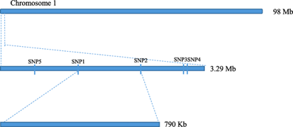 ? ? ? 由于3.29Mb區(qū)間仍包含大量基因,作者進一步開發(fā)出16個KASP標記,其中5個有效的KASP標記用于147個單株(141個來自F2,6個來自F1,Ontario792?與Moneymaker)的基因分型。對Ontario792,Moneymaker與F1群體的KASP分型結(jié)果與測序結(jié)果一致,暗示測序結(jié)果與KASP分型是可靠的。接著,利用遺傳圖譜及KASP標記將定位區(qū)間鎖定在SNP1與SNP2之間(790kb,圖4.)。幸運的是,這個區(qū)間只有一個注釋基因Solyc01g007130.3,編碼受體蛋白激酶TMK1,其中含有一個LRR基序,這是抗病基因的一般特征,暗示Solyc01g007130.3是Cf-10抗病候選基因。然而,基于重測序數(shù)據(jù)在兩親本間并沒有發(fā)現(xiàn)Solyc01g007130.3中存在SNPs或InDels,進一步利用Sanger測序也沒有發(fā)現(xiàn)序列間差異。盡管如此,這并不能排除親本間存在甲基化修飾的差異,并且此基因上游啟動子等調(diào)控序列可能也存在著變異。