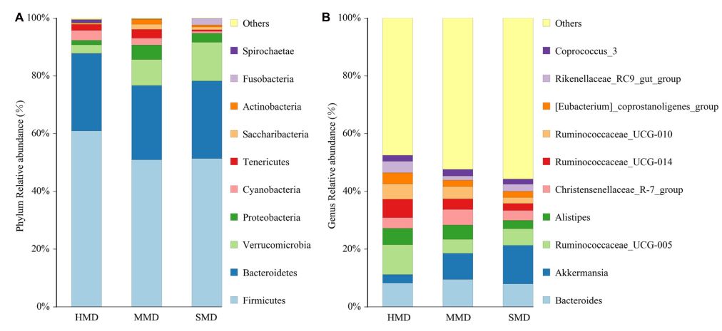 1、試驗材料:選擇了4-6歲的成年森林麝鹿,包括8只健康麝(HMD)(編號H1-H8),8只輕度腹瀉麝(MMD)(編號M1-M8),和5只嚴(yán)重腹瀉的麝(SMD)(編號S1-S5)。共收集了21份糞便樣本。2、試驗方法:Illumina HiSeq 2500?,16SV3+V4