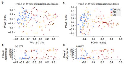 本研究從155例(PRISM)樣本中共檢測(cè)出8,000多種代謝物,這些代謝物在健康人群與CD患者之間差異較大,UC患者的代謝物與健康人群和CD患者均有一定程度相似(圖1.b)。糞便樣品中的鈣保護(hù)素與代謝物、菌群結(jié)構(gòu)變化的第一主軸(PCoA)相關(guān)性均較強(qiáng)(圖1.d.1e),UC患者的炎癥程度既與健康人群相似又與CD患者相似,表明UC患者之間的腸道菌群結(jié)構(gòu)與代謝組份差異較大。