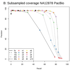 根據(jù)兩個(gè)人類數(shù)據(jù)集的錯(cuò)誤情況和read長(zhǎng)度,作者對(duì)兩條人的染色體模擬了50X?Pacbio?和ONT?read 。純粹的統(tǒng)計(jì)分析發(fā)現(xiàn),近10X覆蓋度的數(shù)據(jù)(平均長(zhǎng)度10kb)就足夠去推斷所有SV斷點(diǎn)(一瞬間覺得自己可以省好多錢有木有),然而對(duì)于100bp的短read雙端測(cè)序至少要25X覆蓋度。當(dāng)前這個(gè)統(tǒng)計(jì)只是一個(gè)理想情況,比如缺乏了重復(fù)和覆蓋度的偏移,因此是低估了所需的覆蓋度。