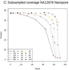 對(duì)于Nanopore的數(shù)據(jù),在20X的覆蓋度時(shí)就能達(dá)到82.24%的準(zhǔn)確率和84.23%的識(shí)別率。不過這可能是因?yàn)镺NT數(shù)據(jù)只測(cè)了28X。