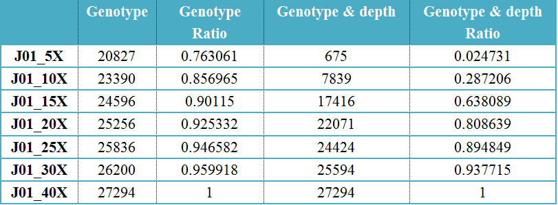 注:Genotype列代表不同深度下識(shí)別出的和40X SV基因型相同的SV個(gè)數(shù),Genotype ratio為SV占40X SV的比例。?Genotype & depth 為與40X SV基因型相同且read支持?jǐn)?shù)大于10的SV個(gè)數(shù),Genotype & depth Ratio為基因型相同且read支持?jǐn)?shù)大于10的SV比例。
