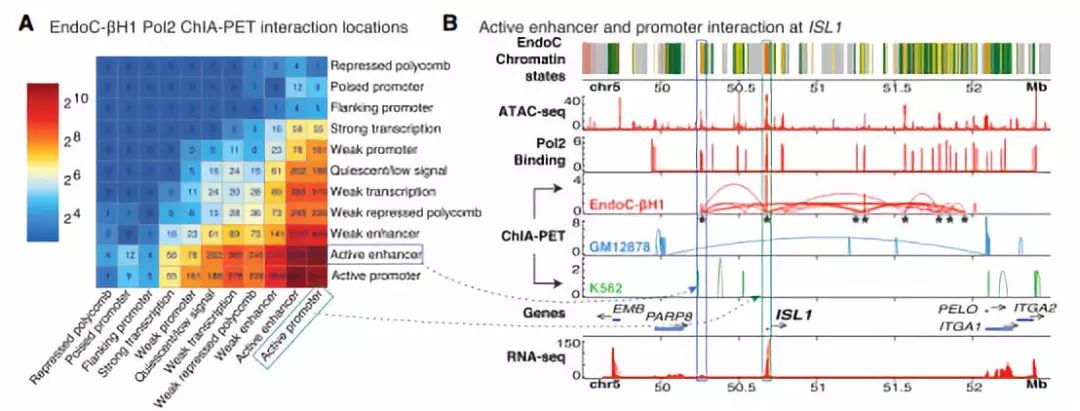 為示意功能性順式調(diào)控網(wǎng)絡(luò),文中在EndoC-bH1中采用RNA聚合酶(Pol2)ChIA-PET,鑒定了25,336個推定的Pol2介導(dǎo)的染色質(zhì)互作。進一步過濾,與ATAC-seq OCRs取交集,得到16,756個互作,大多數(shù)與活性增強子和啟動子關(guān)聯(lián)。且與已在人胰島中報道過的互作一致,包括 ISL1和PDX1位點。