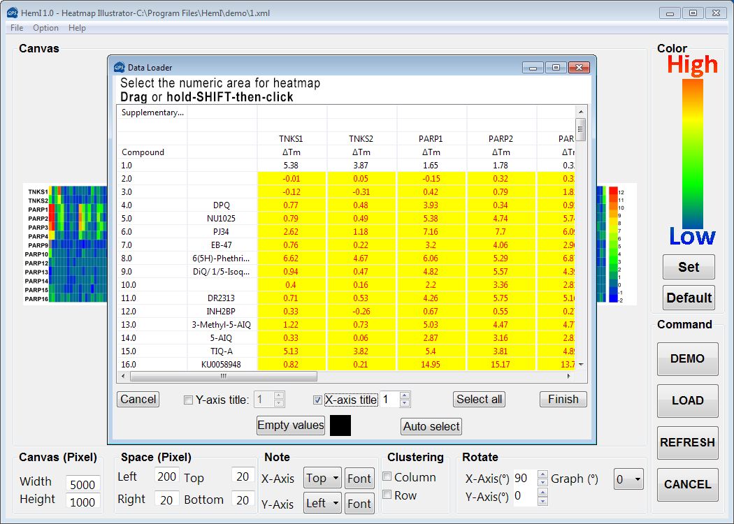 點(diǎn)擊L框中的LOAD按鈕即可打開(kāi)要生成heatmap的文件,excel格式也可以。X-axis title是選擇橫軸坐標(biāo)對(duì)應(yīng)到輸入文件的哪一行,選擇auto select自動(dòng)選擇矩陣數(shù)據(jù)。