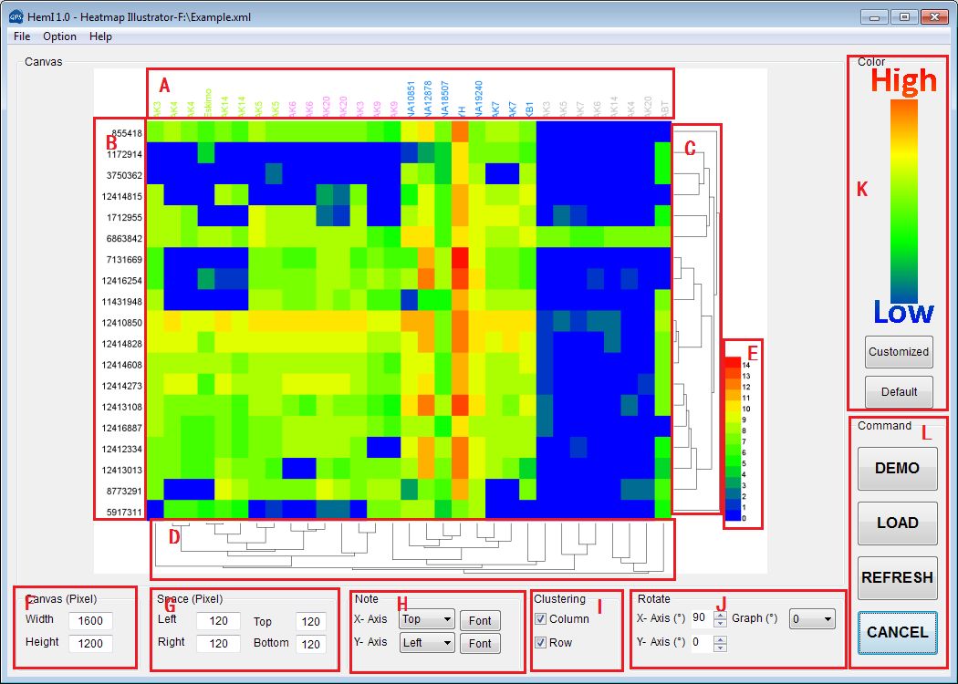 A: 列標(biāo)題。B: 行標(biāo)題。C: 行聚類效果。D: 列聚類效果。E: 顏色標(biāo)尺。F: 畫(huà)布大小(像素)。G: A (頂部)/D (底部) 的高度和B (左側(cè))/C (右側(cè))的寬度。(像素)