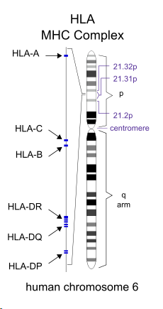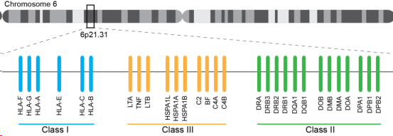 HLA全長(zhǎng)約3.6M,含有220多種功能不同的基因,是目前已知的人類染色體中基因密度最高、多態(tài)性最為豐富的區(qū)域,位置示意圖如下: