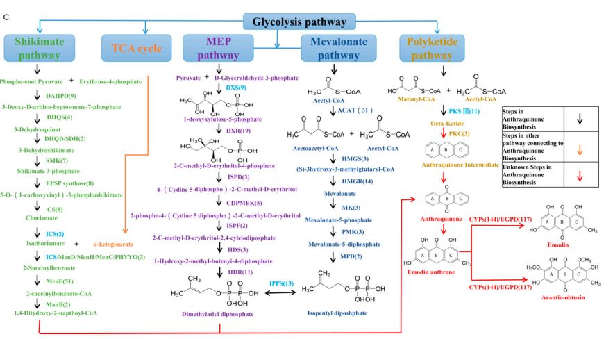 圖1.決明子內參與橙黃決明素生物合成潛在代謝通路