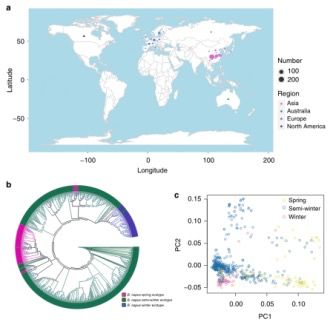 作為較早的異源多倍體作物之一,B.napus通過B. rapaB.oleracea雜交形成,估計甘藍型油菜(B.napus)的形成時間為~6700和~7500年前及38000-51000年前。文獻中記載,冬季甘藍型油菜首次在歐洲種植,大約在1700年,春季甘藍型油菜開始種植并在18世紀末傳播到英國,半冬生態(tài)型主要在中國種植,在1930 – 1940年間從歐洲引入。然而,并沒有真正已知的野生甘藍型油菜(B.napus)群體,導致雜交形成B.napus的兩個祖先種的√確身份仍然難以捉摸,因為B. rapaB. oleracea具有形態(tài)多樣的亞種,并且通常在整個歐洲種植了幾百年。這些物種之間的天然雜交偶然性地在適當?shù)臈l件下發(fā)生。雖然最近的一項研究表明甘藍型油菜(B.napus)的A亞基因組可能來源于歐洲蕪菁(B. rapa ssp. rapa)的祖先,但是由于僅5份B.napus和27份?B. rapa種質(zhì)被納入該項分析中,因此需要提供更多支持該結(jié)論的證據(jù)。先前基于細胞核和葉綠體標記的研究也表明,甘藍型油菜可能是從蘿卜和西蘭花之間的種間雜交發(fā)育而來,或是由幾個獨立的雜交事件形成的。為了進一步了解甘藍型油菜的進化,有必要揭示野生種或馴化種的供體是否是親本祖先,其中B. rapaB. oleracea亞種參與甘藍型油菜的形成。