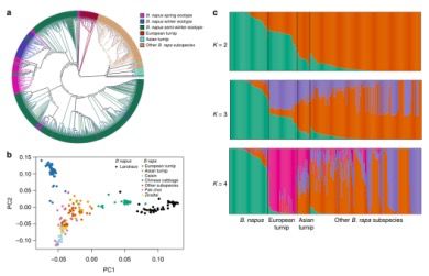 甘藍型油菜(Brassica napus,2n=4x=38,AACC)是一種重要的異源多倍體作物,其來自于白菜型油菜(Brassica rapa,2n=2x=20,AA)和甘藍(Brassica oleracea,2n=2x=18,CC)的種間雜交。然而,真正的野生B. napus群體尚不清楚,其起源和改良過程仍不清楚。在本研究中,研究人員利用重測序的方法對588份甘藍型油菜(Brassica napus)進行測序,揭示了A亞基因組可能從歐洲蕪菁的祖先進化而來,而C亞基因組可能是從大頭菜,花椰菜,西蘭花和中國羽衣甘藍的共同祖先進化而來。此外,冬季油籽型可能是歐洲油菜的原始形式。防御反應(yīng)相關(guān)基因在亞基因組上的特異性選擇有助于物種形成后的環(huán)境適應(yīng)性,而不對稱的亞基因組選擇導致生態(tài)型的變化。通過結(jié)合全基因組關(guān)聯(lián)分析(genome-wide association studies),群體選擇分析及轉(zhuǎn)錄組分析,研究人員鑒定了與提高的脅迫耐受性,含油量,種子質(zhì)量和生態(tài)型改良相關(guān)的基因,這些基因成為甘藍型油菜(Brassica napus)進一步功能鑒定和遺傳改良的候選基因組。