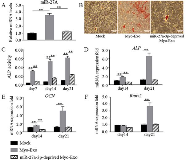 將外泌體標(biāo)記與MC3T3-E1共孵育,觀察到這類外泌體(myo-exosomes)能夠被MC3T3-E1細(xì)胞攝入。并且MC3T3-E1細(xì)胞的成骨分化也能夠被促進(jìn),表現(xiàn)為增強(qiáng)的ALP活性,基質(zhì)礦化增強(qiáng),與標(biāo)記基因ALP/OCN/RUNX2表達(dá)上調(diào)。對C2C12成肌細(xì)胞分泌的外泌體進(jìn)行小RNA測序,基于測序結(jié)果,鑒定出來的miRNA進(jìn)行共有分析,其中有12個(gè)miRNA分子高表達(dá),一些功能被證實(shí)的與成骨相關(guān)的miRNA分子,例如miR-27a-3p也包括在內(nèi)。