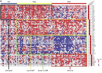 該研究共鑒定到11340個不同的基因產(chǎn)物,覆蓋了腫瘤細(xì)胞及腫瘤微環(huán)境所有可能表達(dá)的蛋白。研究人員對胃癌與癌旁組織全蛋白表達(dá)譜進(jìn)行聚類分析,將彌漫型胃癌分為三個分子亞型(PX1~3),且這三個亞型與生存預(yù)后和化療敏感性密切相關(guān)。這是世界上實現(xiàn)在蛋白層面上對腫瘤進(jìn)行分子分型,且分的的亞型與預(yù)后和化療有顯著性關(guān)聯(lián)。其中PX1型(細(xì)胞周期型),總生存時間最長;PX2型 (上皮-間充質(zhì)轉(zhuǎn)化型),生存預(yù)后介于PX1和PX3之間;PX3 (免疫通路富集型)患者腫瘤組織高表達(dá)蛋白富集在免疫響應(yīng)相關(guān)通路和EMT相關(guān)蛋白上,總生存時間最短,并且該組患者對化療不敏感。