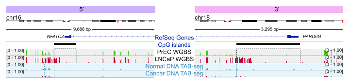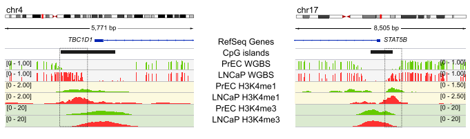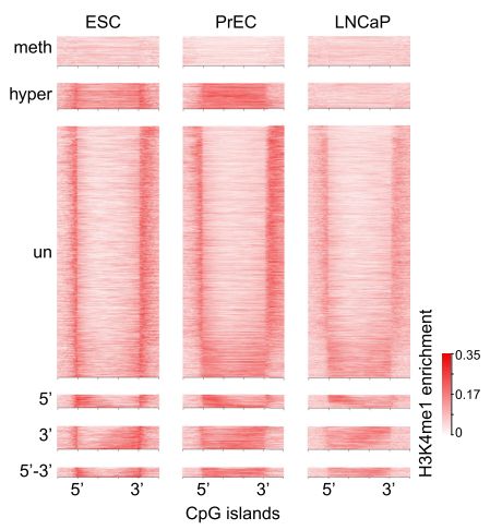 采用chip-seq數(shù)據(jù),分析H3K4me1在癌癥CpG島超甲基化中的富集方式。H3K4me1高富集于hESCs CpG島的body區(qū),在癌癥中呈現(xiàn)廣泛超甲基化。相反,癌癥中未甲基化的CpG島,在hESCs中表現(xiàn)為邊界雙峰富集及島區(qū)域降低。并且,文章發(fā)現(xiàn)一種hESCs中不對(duì)稱的H3K4me1富集模式,在對(duì)應(yīng)5’或3’內(nèi)CpG島邊界,易于癌癥中DNA甲基化。通過(guò)可視化圖展現(xiàn)了候選的CpG島,顯示癌癥中5’和3’的甲基化堆積,可以由正常前列腺細(xì)胞中H3K4me1預(yù)先標(biāo)記。