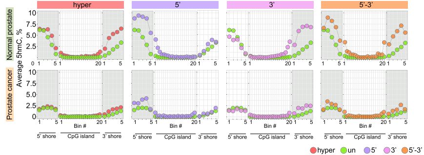 文章結(jié)果發(fā)現(xiàn)在5’或3’不對(duì)稱甲基化的CpG島邊界,正常細(xì)胞中具有高甲基化,但廣泛甲基化的或雙向甲基化堆積的CpG島在island shores具有高甲基化水平。正常組織中5hmC對(duì)DNA去甲基化及未甲基化CpG島的保護(hù)具有重要作用。此外癌組織中5hmC大范圍的減少可能會(huì)參與CpG島的超甲基化。文章采用3對(duì)前列腺癌樣本進(jìn)行5hmC與5mC檢測(cè),正常組織中表現(xiàn)出增強(qiáng)的CpG島shores 5hmC水平,且基因CpG島DNA甲基化堆積伴隨shores處5hmC的降低。