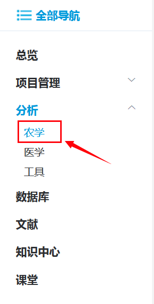 首先,您需要登錄到百邁客云平臺網(wǎng)址(http://www.biocloud.net/),點(diǎn)擊全部導(dǎo)航->分析->農(nóng)學(xué)
