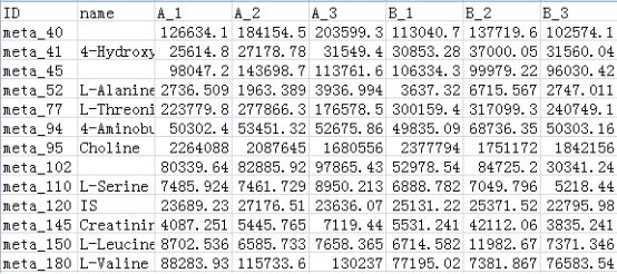 注:第一列為代謝物ID,第二列為代謝物定性名稱,第三列至最后為各個(gè)樣本的定量信息。
