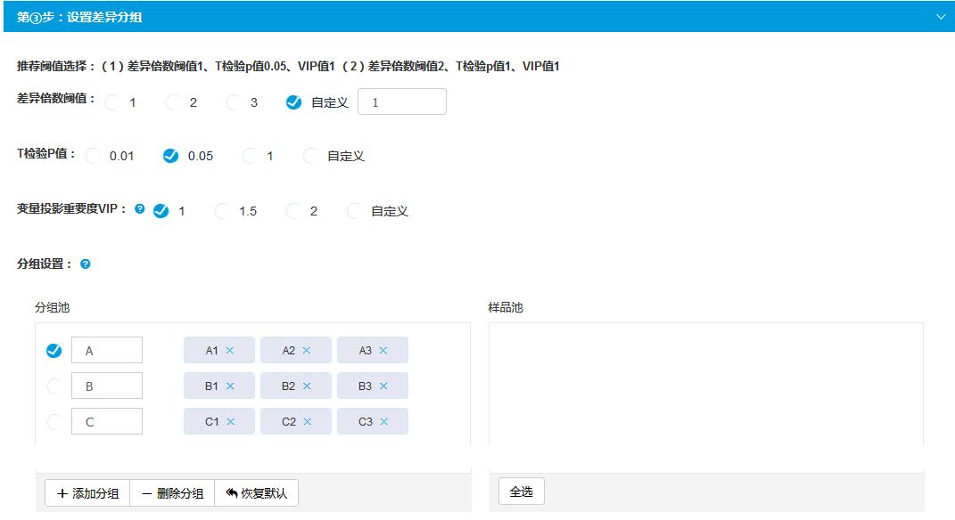 設(shè)置差異分析的條件:包括差異倍數(shù)、T檢驗(yàn)p值、VIP值、以及差異分組