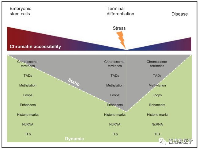 作者以此研究為基礎(chǔ),結(jié)合前人研究結(jié)果,構(gòu)建了發(fā)育和疾病發(fā)生中表觀基因組的變化模型(如下圖)。發(fā)育過程中伴隨著染色質(zhì)的變化,使最終分化的細(xì)胞具有穩(wěn)定的轉(zhuǎn)錄組,而疾病破壞了這種平衡,通過影響染色質(zhì)結(jié)構(gòu)、增強子-基因loop、組蛋白修飾、DNA甲基化等,將基因組的特定區(qū)域轉(zhuǎn)變?yōu)楦鼊討B(tài)的構(gòu)象。