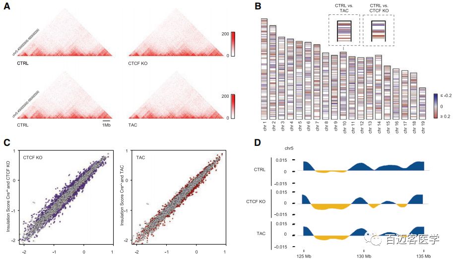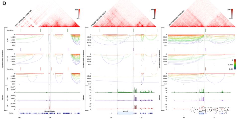 正常對照成年小鼠(CTRL)和兩個不同的疾病模型(TAC、CTCF-KO)小鼠的Hi-C結(jié)果揭示了5 kb分辨率下心肌細(xì)胞的基因組相互作用,得到了染色體內(nèi)和染色體間的互作事件,并為未來的心臟表觀基因組研究提供了依據(jù)。壓力超載或CTCF缺失選擇性地改變了TAD的邊界強度和A/B?compartment、基因組可及性。心力衰竭涉及致病基因周圍染色質(zhì)互作穩(wěn)定性的降低。此外,壓力超負(fù)荷或CTCF缺失重塑了心臟增強子的長距離互作,導(dǎo)致這些功能元件周圍局部染色質(zhì)互作顯著減少。