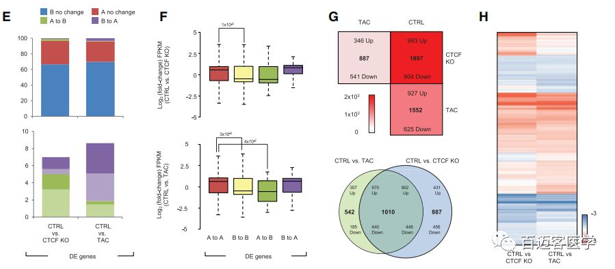 CTCF的缺失或TAC對染色體的A compartment和B?compartment的影響較小,而其中發(fā)生compartment轉(zhuǎn)換的區(qū)域與基因表達(dá)呈正相關(guān),即從A?compartment到B?compartment轉(zhuǎn)換區(qū)域的基因表達(dá)下調(diào),從B?compartment到A?compartment轉(zhuǎn)換區(qū)域的基因表達(dá)上調(diào)。CTCF-KO、TAC小鼠間存在41%的共有差異表達(dá)基因,兩者都表現(xiàn)出已知的標(biāo)志基因激活。ChIP-seq檢測到CTCF靶向基因的轉(zhuǎn)錄起始位點,而這些基因富集在與心臟病相關(guān)的通路中。