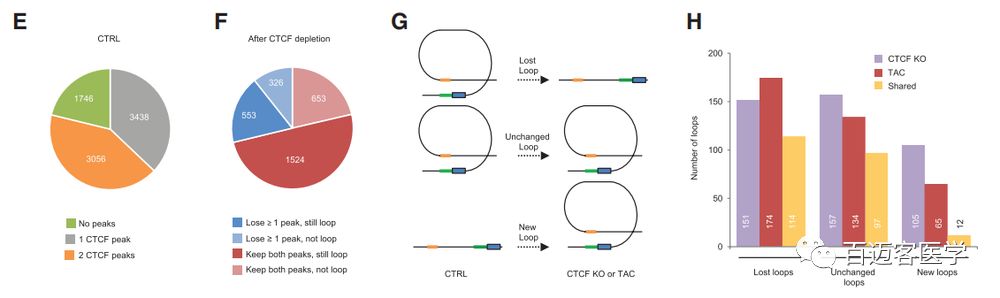CTCF-KO、TAC小鼠的染色體長距離loop大小沒有明顯變化,但loop總數(shù)量減少。相比于對照組,CTCF-KO和TAC中消失的長距離loop中有51%兩者共有的,而新出現(xiàn)的loop中只有15%是兩者共有的;在疾病細(xì)胞中丟失的loop數(shù)大于新形成的loop數(shù)。在疾病細(xì)胞中發(fā)生重組(丟失/新形成)的loop中,富集與心血管功能相關(guān)通路中的基因。此外,重組loop中亦包含大量增強子–啟動子loop,其中在疾病細(xì)胞中丟失的loop富集與心臟病理相關(guān)的基因。