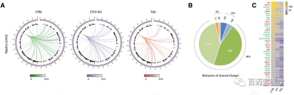 存在互作的9194個表達(dá)基因中,60%的基因在CTCF-KO和TAC中的互作變化方向相同。而剩余的40%基因中大多數(shù)(75%)是在某一組疾病細(xì)胞中虎作沒有發(fā)生變化的,25%是互作變化在兩組中相反的。在CTCF-KO和TAC中互作改變相同且差異表達(dá)的3651個基因中,絕大多數(shù)(86%)的局部互作減少(圖4B)。這些發(fā)現(xiàn)支持了這樣一種趨勢,即更多的動態(tài)染色質(zhì)互作影響基因表達(dá),兩組疾病細(xì)胞與對照相比,它們的基因表達(dá)變化方向更可能趨向一致?;プ鲾?shù)量top 40的差異表達(dá)基因在疾病細(xì)胞中的互作持續(xù)下降,如與鈣依賴信號和心肌肥厚相關(guān)的基因Ppp3ca。