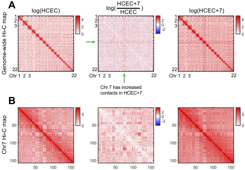 作者研究了一個(gè)正常核型的健康結(jié)腸粘膜構(gòu)建的細(xì)胞系及其同源的衍生細(xì)胞系,該衍生細(xì)胞系唯一異常是有一個(gè)額外的7號(hào)染色體拷貝(47,XY,+7)。作者使用Hi-C、RNA測(cè)序和蛋白質(zhì)組分析研究了非整倍化后結(jié)構(gòu)、功能的變化及其關(guān)系。7號(hào)染色體的增加導(dǎo)致了該染色體基因轉(zhuǎn)錄水平的增加,以及全基因組基因和蛋白表達(dá)的變化。Hi-C分析表明,7號(hào)染色體的額外拷貝反映在三倍體染色體間有更多的染色體間互作,且全基因組范圍內(nèi)出現(xiàn)了染色質(zhì)組織的變化,包括A/B區(qū)域化和拓?fù)潢P(guān)聯(lián)域(TAD)邊界的變化。最值得注意的是,4號(hào)染色體顯示出染色質(zhì)組織的嚴(yán)重缺失,而14號(hào)染色體包含一個(gè)大的A/B?compartment轉(zhuǎn)換區(qū)域,同時(shí)其中的基因表達(dá)發(fā)生改變。間期FISH檢測(cè)染色體涂染探針距離發(fā)現(xiàn)額外的7號(hào)染色體區(qū)域的核位置未發(fā)生變化。此外衍生細(xì)胞系中基因和蛋白富集在惡性轉(zhuǎn)化的關(guān)鍵信號(hào)通路,如HGF/MET-axis??傊?,一個(gè)特異的染色體非整倍體對(duì)核結(jié)構(gòu)和功能有重大影響,無論是局域的還是全基因組的,此研究為分析具有復(fù)雜核型的癌癥核組織提供了一個(gè)基礎(chǔ)。