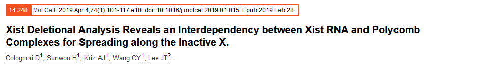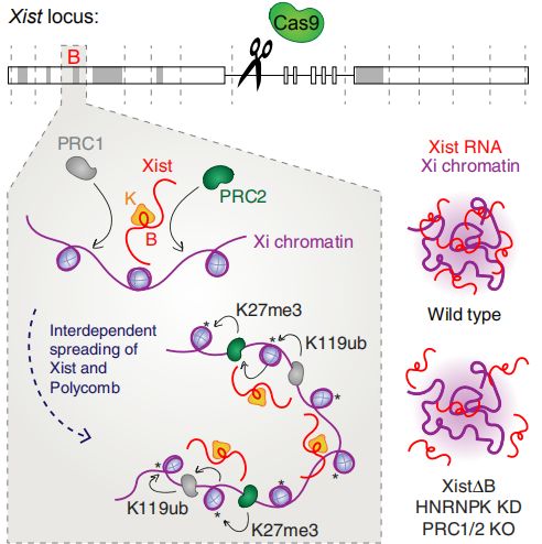 在X染色體失活期間,Xist RNA傳播包覆整個(gè)染色體,以建立沉默,但是參與傳播的功能RNA元件及機(jī)制仍未確定。作者通過一個(gè)全面的內(nèi)源性Xist缺失研究,發(fā)現(xiàn)Repeat B 對(duì)于在Xist的傳播和多梳狀復(fù)合物1和2 (PRC1/PRC2)的作用至關(guān)重要,會(huì)影響染色體的三維結(jié)構(gòu)。刪除Repeat B或其直接結(jié)合伴侶HNRNPK會(huì)影響PRC1和PRC2的招募。反過來,去除PRC1或PRC2又會(huì)削弱Xist的傳播。因此,Xist和多梳狀復(fù)合物傳播包覆整個(gè)染色體時(shí)具有彼此依賴性,這三個(gè)因子對(duì)于X染色體失活至關(guān)重要,且三者是密不可分的。