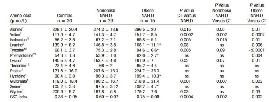 在NAFLD患者體中,經(jīng)常發(fā)現(xiàn)血漿中氨基酸的濃度增加,特別是支鏈氨基酸。然而,這一現(xiàn)象也可能是由于肌肉蛋白質(zhì)分解增加,肥胖和/或胰島素抵抗(IR)增加或是由于受損的組織代謝導(dǎo)致,其具體機(jī)制尚未可知。