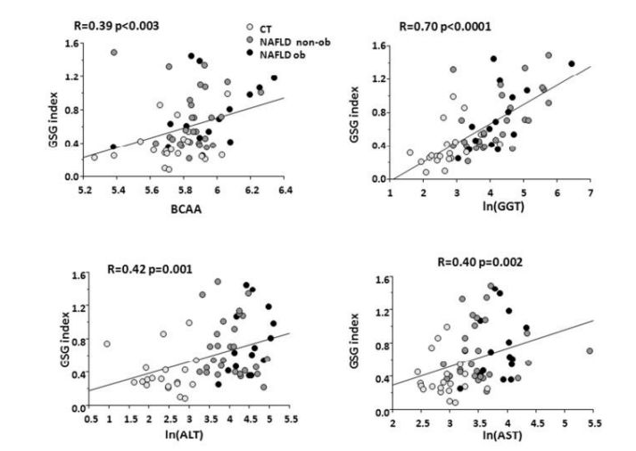 這些氨基酸以某種方式參與合成谷胱甘肽(GSH)和脂毒性相關(guān)的脂質(zhì)前體。 因此,我們測(cè)試了GSG指數(shù)與肝臟組織學(xué)改變的相關(guān)性,其中GSG-index指數(shù)計(jì)算了[Glutamate/(Serine+Glycine)]。