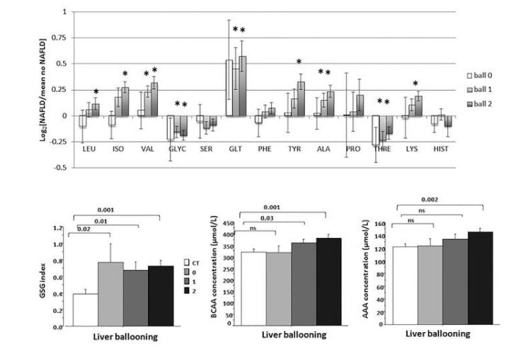 我們首先檢測(cè)肝臟炎癥和氣球樣變時(shí)哪些氨基酸的濃度改變。相比于對(duì)照組,氣球樣變2級(jí)的患者血漿中BCAA、AAA、谷氨酸,丙氨酸和賴氨酸含量增加,而甘氨酸和蘇氨酸濃度下降。 氨基酸濃度也與肝纖維化增加有關(guān),但在纖維化評(píng)分為3和4的NAFLD中觀察到的濃度與纖維化評(píng)分為0-2的患者沒有顯著差異。