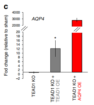 作者通過ATAC-seq和轉錄組測序數(shù)據(jù)篩選出來TEAD1的候選靶基因,并進一步利用ChIP-PCR,驗證了與TEAD1結合的靶基因–AQP4、EGFRCDH4。TEAD1敲除使AQP4下調(diào),TEAD1過表達可恢復AQP4的表達,而TEAD1和AQP4過表達均可修復TEAD1KO細胞的遷移缺陷,說明TEAD1作用于靶基因AQP4,調(diào)控其表達,進而參與GBM遷移的直接調(diào)控機制。